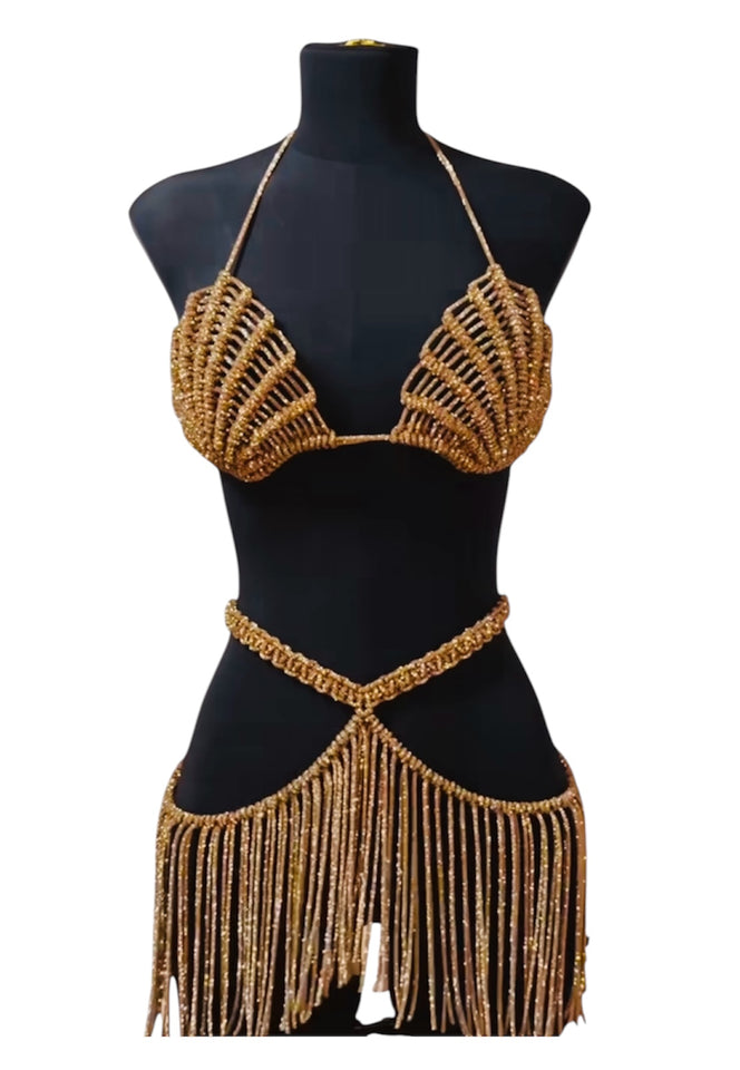 Check out our new Glitz beach wear line. This gold fringe set is covered in rhinestones that catch every ray of sunlight! The criss-cross waist detail frames your shape while the fringes drapes over the hips for a glamorous hour glass effect. Perfect for pool parties, beach photoshoots or vacations. Wear it over your favorite swim suit for instant luxe, stand-out style that makes you the brightest on the beach!