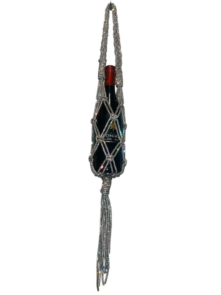 Sparkly macrame wine bottle holder is a stylish and functional decorative piece using the macrame knotting technique. The design is both aesthetic and practical allowing the bottle to hang from a hook or be displayed as a part of home decor . This Handmade item with rhinestone cords is perfect for wine lovers who appreciate unique decor it can be used as an eye-catching display piece or as a gift.
